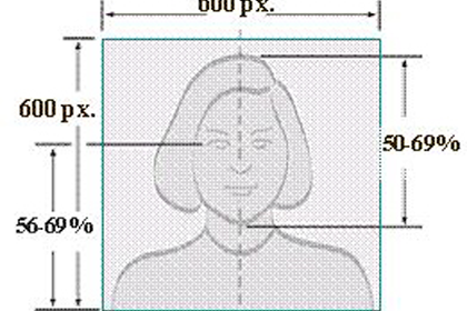 头部尺寸(从头顶发迹至下颔底部)须占整个照片高度的50%到70%。从照片底部至眼睛水平线的高度须占整个照片高度的55%到70%(大约2/3)。