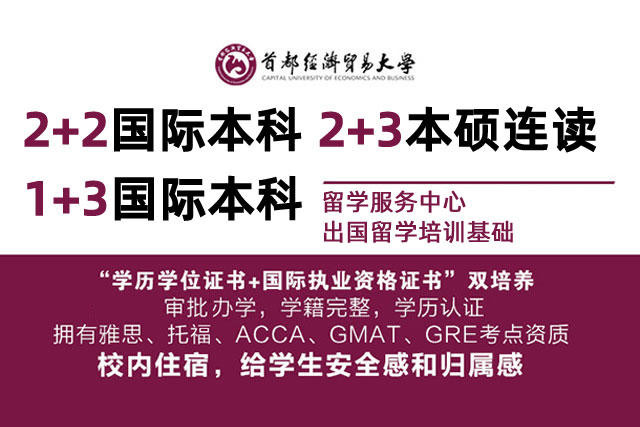 为了满足越来越多的学生出国留学的需求,为学生创建真实、原汁原味西方教育环境,帮助学生快速掌握国外学习方法,提前适应海外生活、缩短留学适应周期,减少昂贵的留学费,使学生在国内就能够享受国外优质教育资源,首都经济贸易大学在中国(教育部)留学服务中心的支持下,与英国、美国、澳大利亚、加拿大等多国名校签署合作协议,开设2+2国际本科课程。学生在首都经济贸易大学通过二年的全日制学习,具备用英语学习专业课的能力,掌握一定的专业理论知识和应用技巧,出国后学生可免修在国内已经修过的学分(最多可豁免 1/3 学分)。