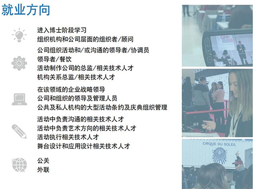 培养方向:针对国际化活动中的营销类、餐饮类、文化类、体育类、会展类项目的推广应用,预算管理及相关技术的具有国际视野的高*管理及运营人才。