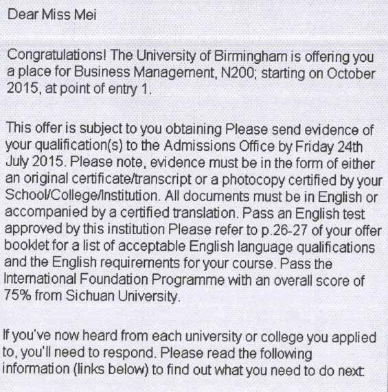 再比如说伯明翰大学,2015年其英国综合排名15、全球QS综合大学排名64,想要就读这所大学的话,不同的专业你需要满足怎样的IFC国际预科认证课程的预科成绩呢?请分别看今年毕业的同学杨越、梅茜的录取信。