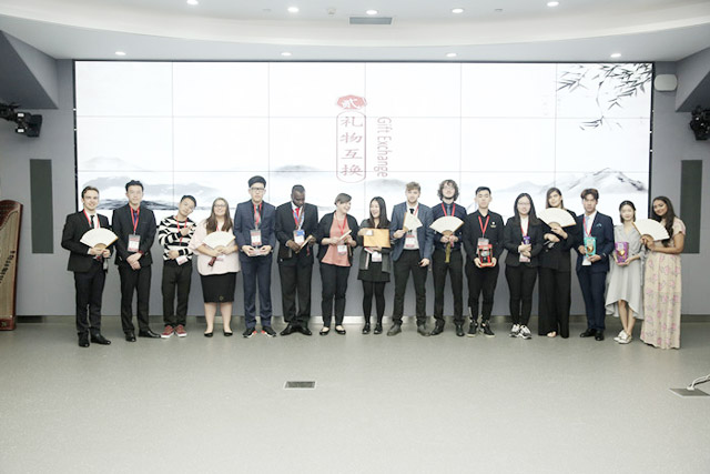 颁奖结束后,北京第二外国语学院蔡坚处长向英国中央兰开夏大学赠送了写有东游图记的书画折扇,中英双方的队员们也互换了礼物,感谢彼此在这活动期间给予的照顾与帮助。
